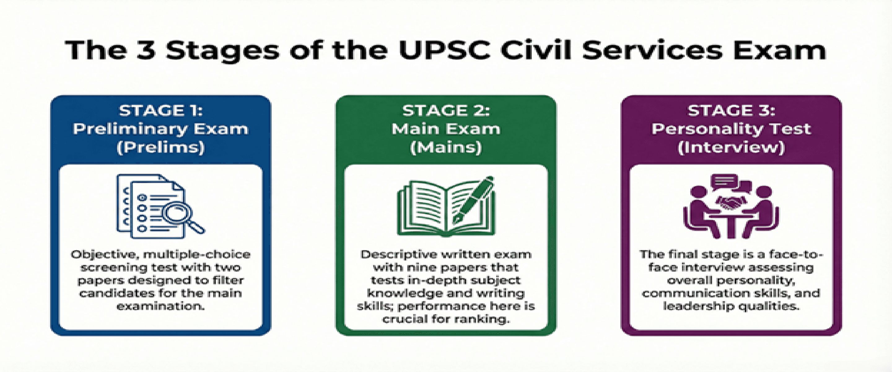 The UPSC Civil Services Examination is a three-tiered assessment designed to test academic expertise and administrative aptitude. Understanding this structure is the first requirement for any serious aspirant.