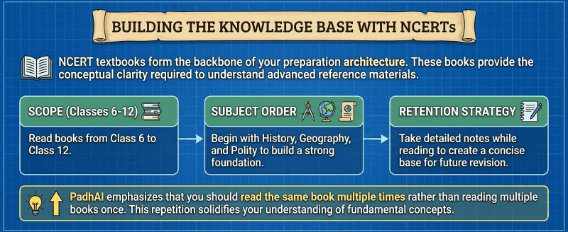 NCERT textbooks form the backbone of your preparation architecture. These books provide the conceptual clarity required to understand advanced reference materials.